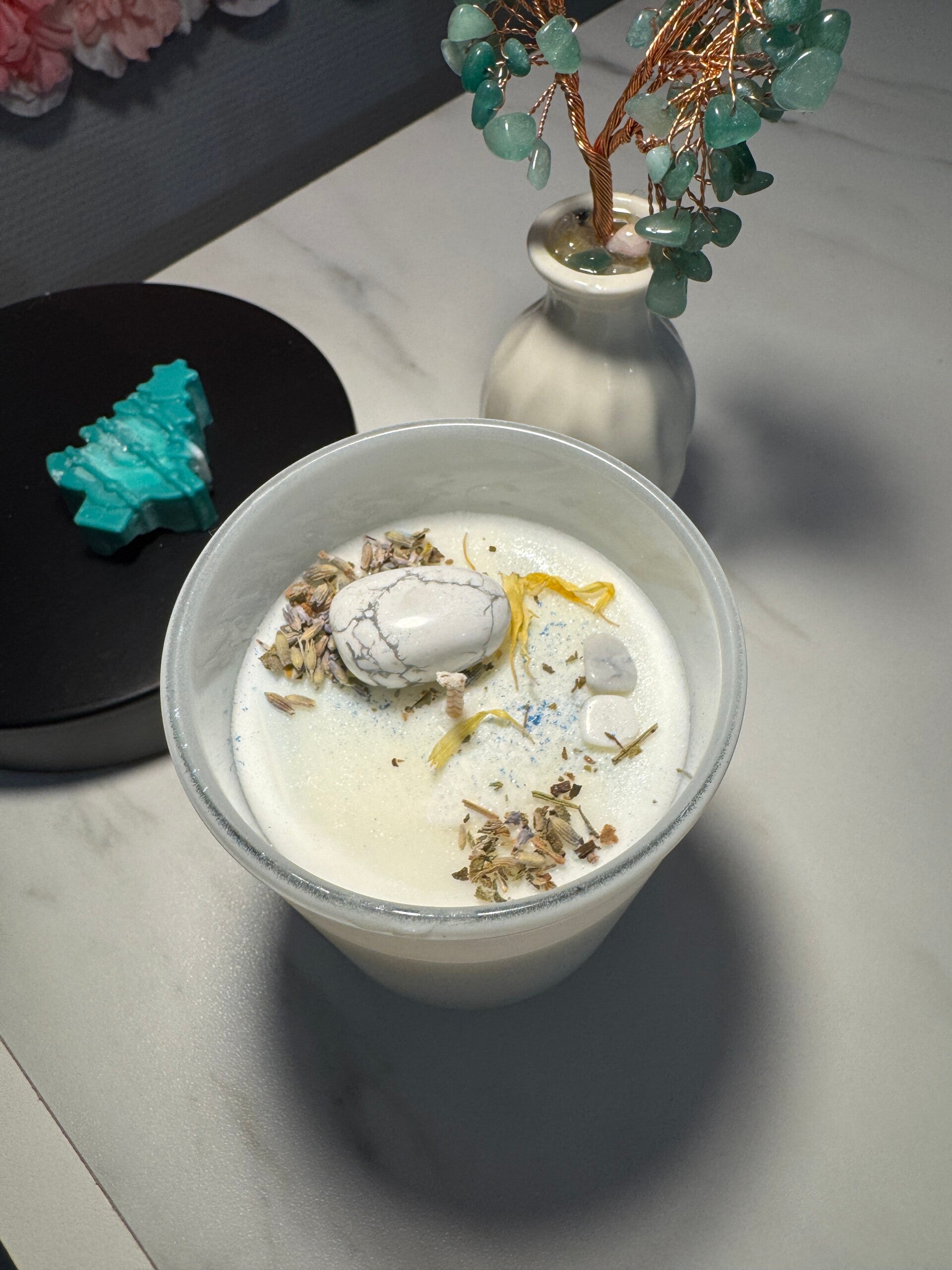Découvrez notre bougie rituelle au parfum de Benjoin, accompagnée de sa pierre Howlite Blanche.